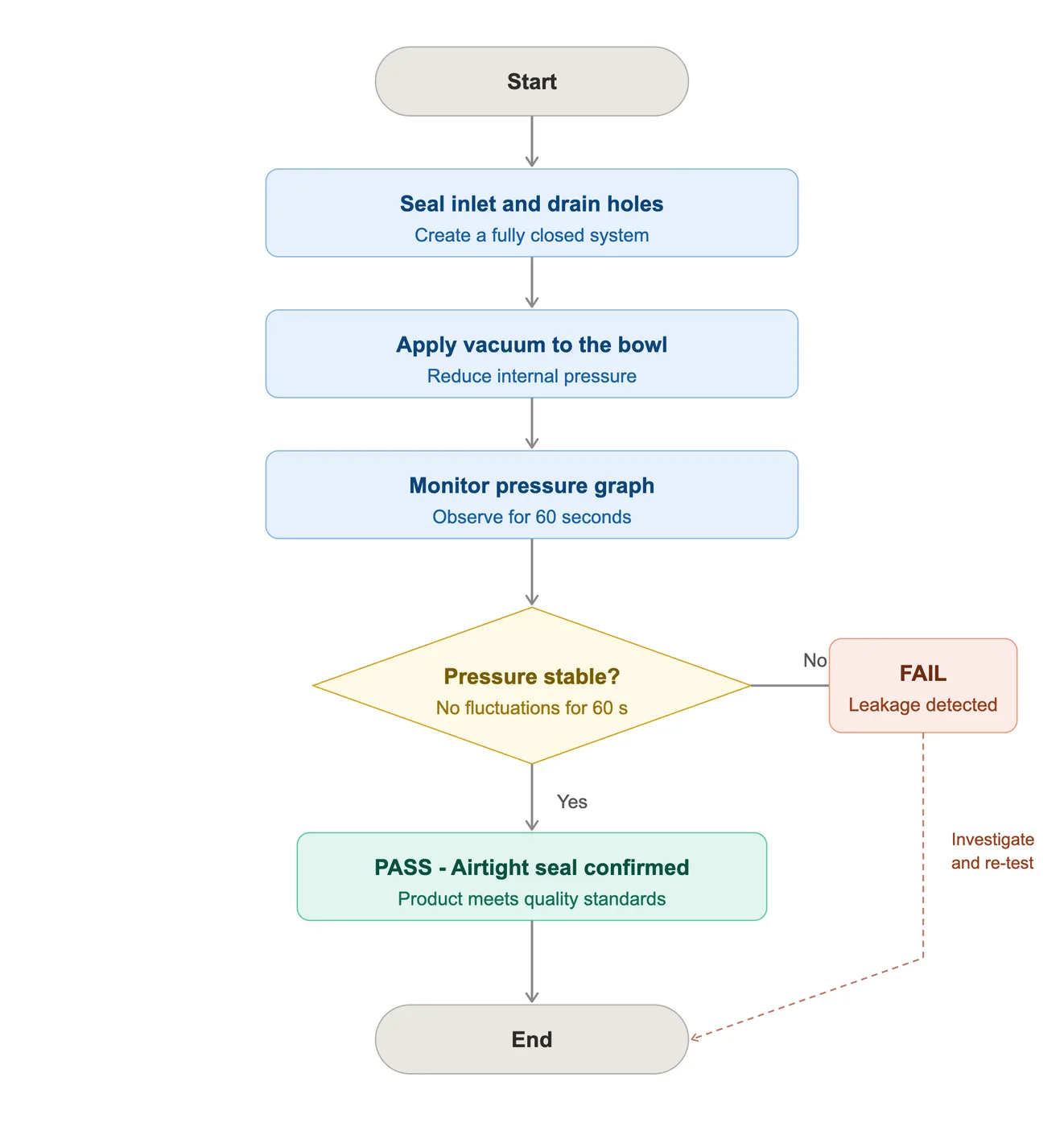 The vacuum should hold steady for 60 seconds without any change. If the pressure is stable for the full 60 seconds, it means the product has no air leakage and it is good quality. If the pressure drops or fluctuates, then there is some problem with the sealing, and the product has to be checked again.